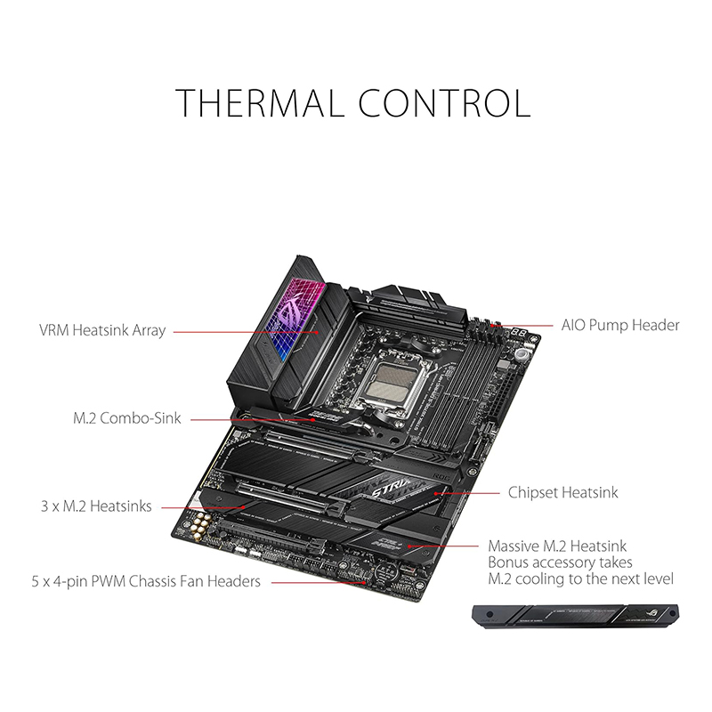 - Optimized Thermal Design: Large VRM heatsinks plus integrated aluminum I/O cover, high-conductivity thermal pad, L-shaped heatpipe, M.2 Combo-sink and M.2 backplate for PCIe 5.0 M.2_1 slot, three on board M.2 heatsinks, plus a massive bundled PCIe 5.0 M.2 heatsink as accessory