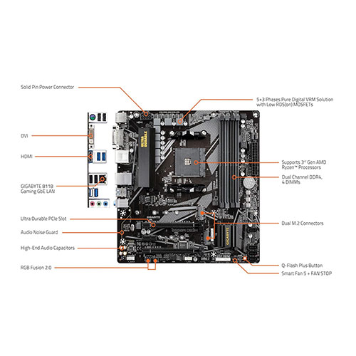 - NVMe PCIe 4 ultrarrápido. 0/3. 0 m. 2 conectores; condensadores de audio de alta calidad y protector de ruido de audio*la máxima calidad de audio; GIGABYTE Exclusive 8118 Gaming GbE LAN con gestión de ancho de banda; soporte HDMI trasero y DVI